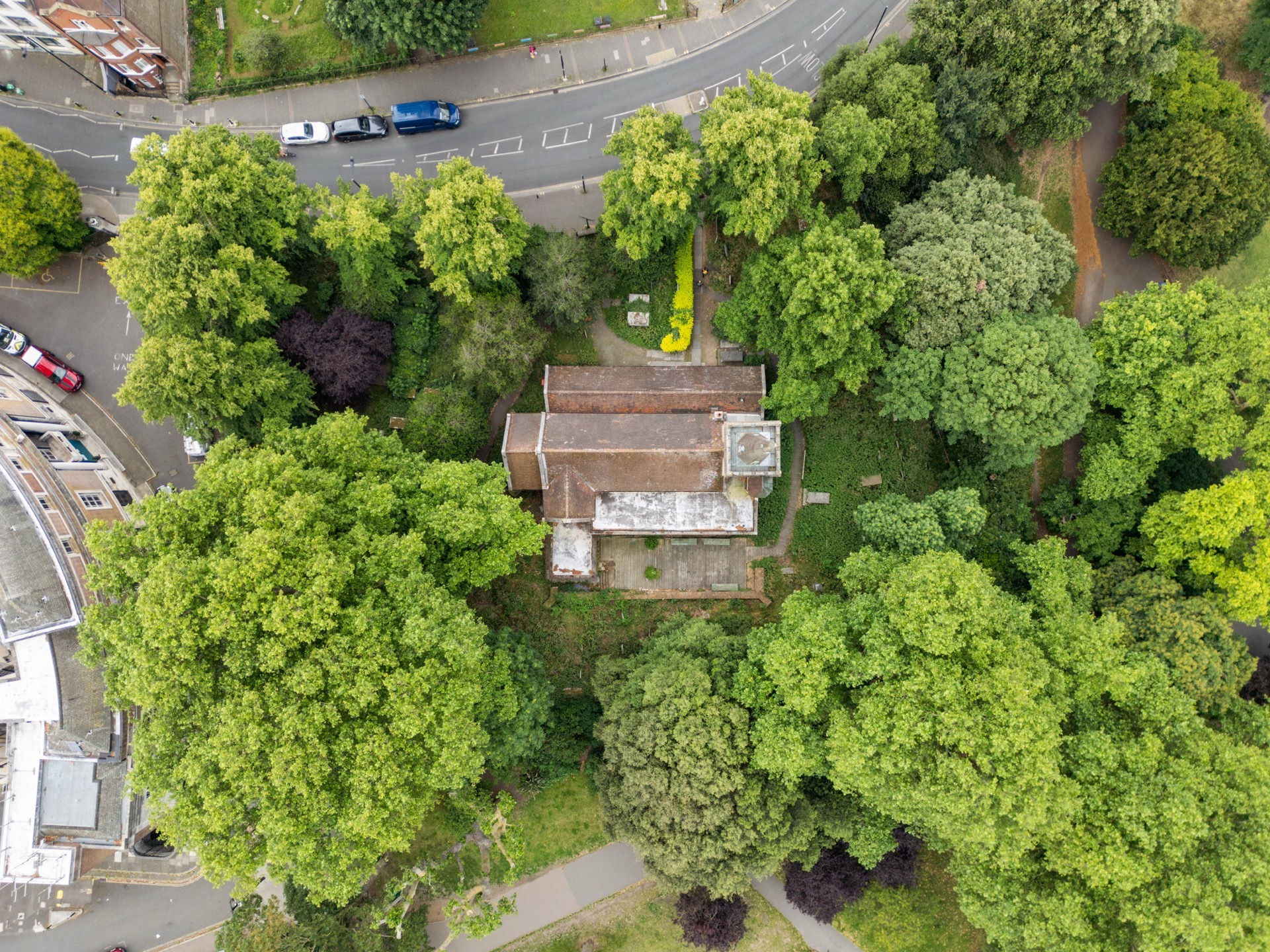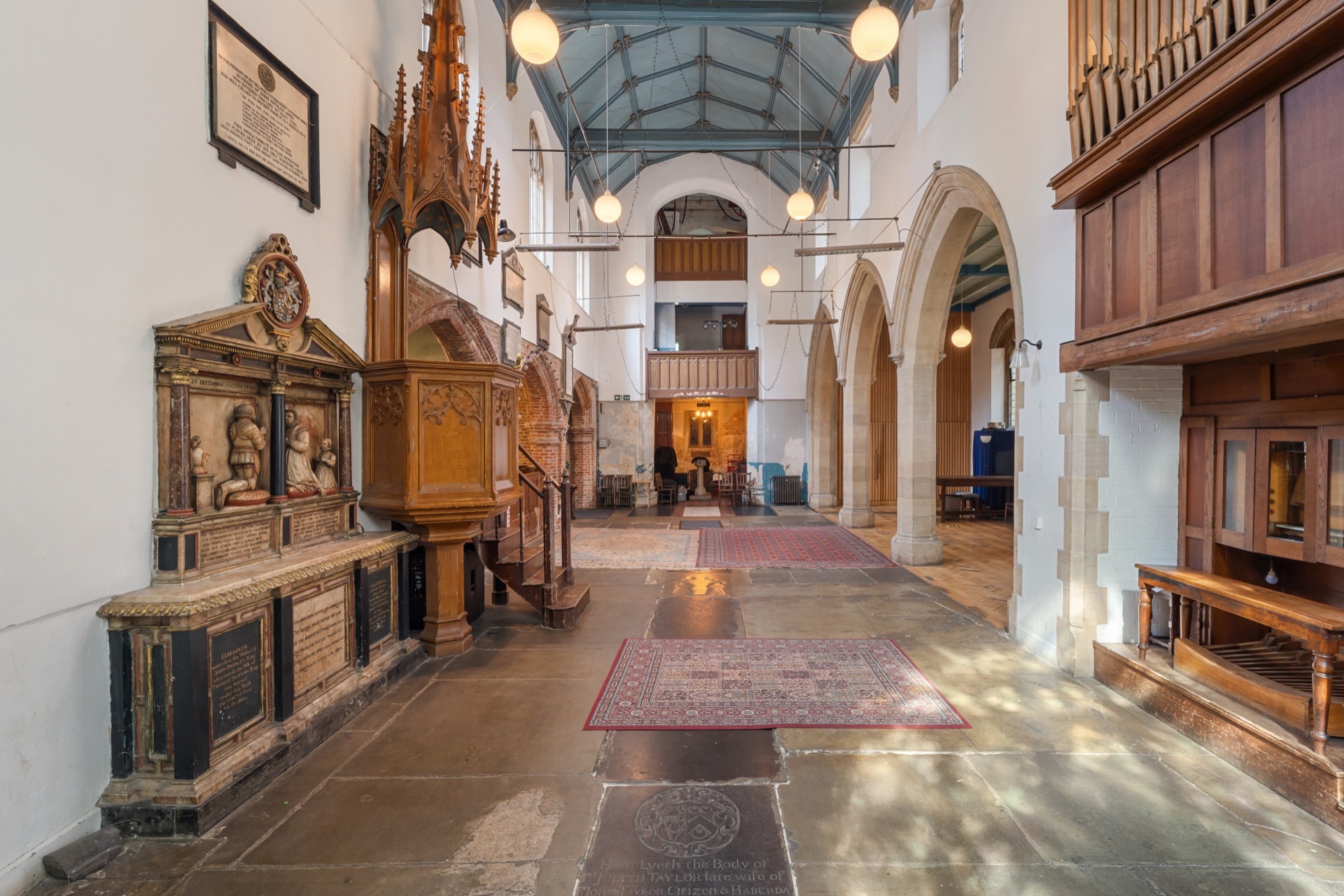 brickwork, to one side the original wooden pews remain , but the main space is